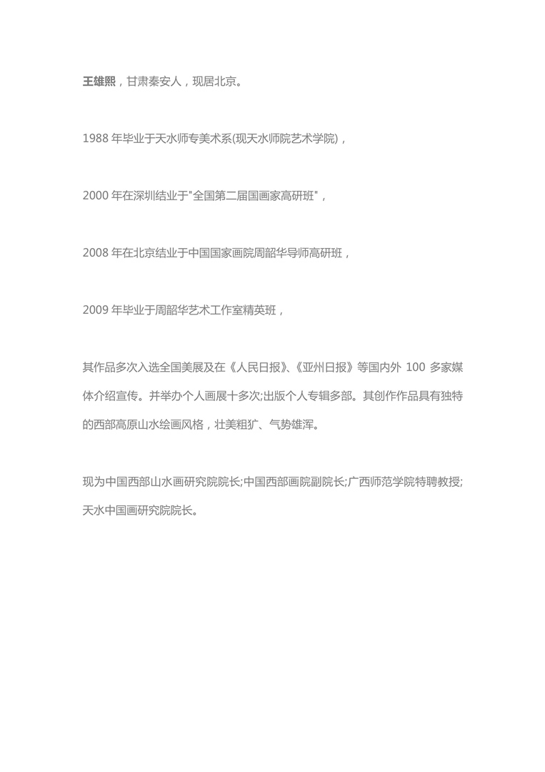 王雄熙,甘肃秦安人,现居北京。1988年毕业于天水师专美术系(现天水师院艺术学院)。2000年在深圳结业于"全国第二届国画家高研班";2008年在北京结业于中国国家画院周韶华导师高研班;2009年毕业于周韶华艺术工作室精英班。其作品多次入选全国美展及在《人民日报》、《亚州日报》等国内外100多家媒体介绍宣传。曾举办个人画展十余次;出版个人画集多部。